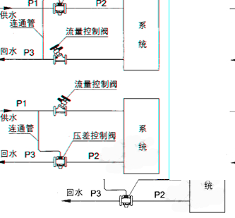 現(xiàn)以安裝在回水管道上的ZYC型自力式壓差控制閥為例說明工作原理。當供水壓力p1增大或減小時,信號由連接管傳如膜片上腔,帶動閥芯下移,使閥座的流通面積減小或增大。P2-P3也增大或減小,直到P1-P2保持原值恒定。當回水壓力P3增大或減小的瞬間同閥座流向出口的流速降低或升高,膜片下壓力P2也在這個瞬間增高或降低,帶動閥芯上移或下移,知道膜片的受力重新平衡,P2恢復原值,P1-P2保護原值恒定,從而保證了被控系統(tǒng)的供回水間壓差基本不變。